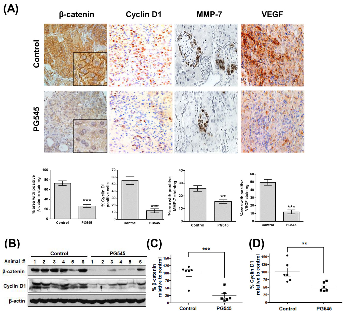 Figure 6: PG545 inhibits β-catenin signaling in AsPC-1 orthotopic xenograft mouse model. (A) Immunohistochemical analysis of β-catenin and β-catenin-regulated proteins, Cyclin D1, MMP-7 and VEGF in pancreatic tumor tissues from mice. Quantitation of staining was performed using 10 fields per analyte. **P < 0.01, ***P < 0.001. (B) Frozen tumor tissues were homogenized on ice and the extracts were subjected to Western blotting. (C) β-catenin and (D) Cyclin D1 levels were quantified by Image J software and plotted relative to the control group in Fig. 6B. **P < 0.01, ***P < 0.001 vs. control.