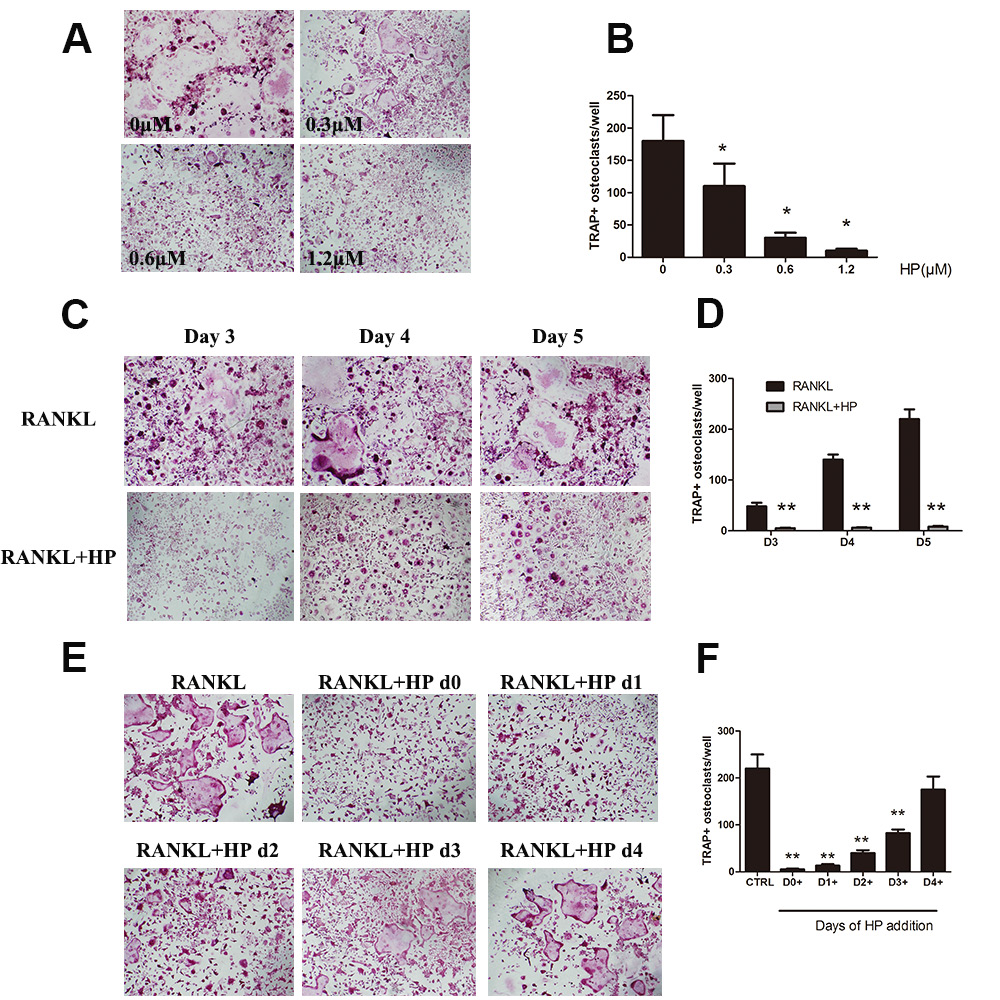 This article has been corrected: Due to errors in image processing, the representative image of TRAP staining in RANKL+HP d1 is incorrect. The proper Figure 1 is shown below. The authors declare that these corrections do not change the results or conclusions of this paper.