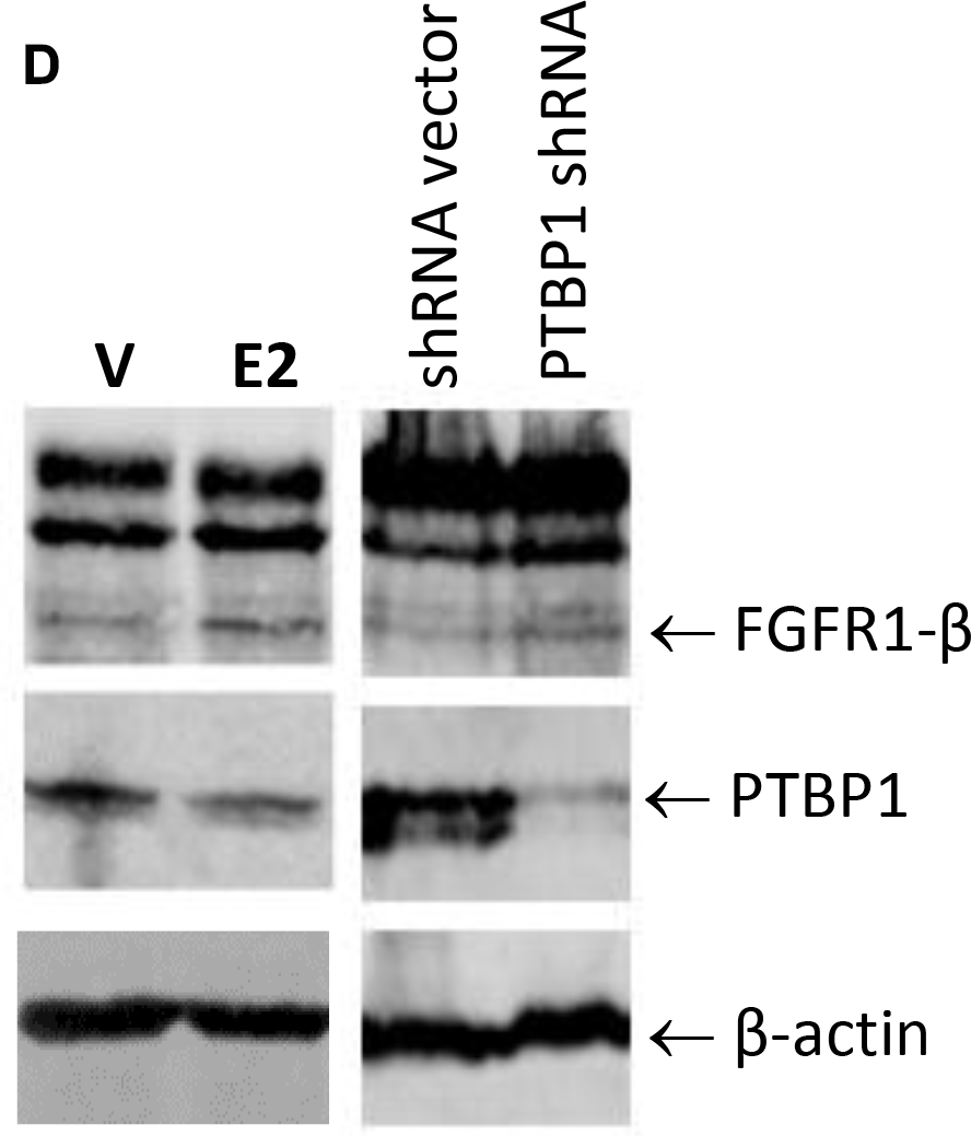 Figure 6: Estrogen regulation of FGFR1 splicing in breast cancer cells. (A) RT-PCR of FGFR1α and FGFR1β. MDA-MB-134VI cells were cultured for 3 days with hormone-deprived FBS, then treated with 17β-estradiol at 0.1μM (E), 4-hydroxytamoxifen at 1μM (T), or both (E+T), or vehicle (V) for 2 days. RT-PCR was performed to detect mRNAs of FGFR1α, FGFR1β, and GAPDH. (B) Immunoblotting. The MDA-MB-134VI cells cultured with hormone-deprived FBS or normal FBS for 3 days were incubated with 17β-estradiol or 4-hydroxytamoxifen treatment respectively for 2 days. E1 and E2: 17β-estradiol at 0.1 and 0.5μM; T1 and T2: 4-hydroxytamoxifen at 1 and 5μM; V: vehicle. (C) Ratio of quantitated FGFR1β/FGFR1α expression in Figure 6B. (D) WB of FGFR1 and PTBP1. MDA-MB- 134VI cells were treated with 17β-estradiol (E2) at 0.1μM or vehicle control for 2 days, or infected with PTBP1 shRNA virus or control shRNA. Expression of FGFR1 and PTBP1 were detected with anti-FGFR1 and anti-PTBP1 antibodies. (E) Effects of drug combination on cell survival. MDA-MB-134VI cells seeded in 96-well plates were incubated with single or combination of 4-hydroxytamoxifen and BGJ-398 at doses from 0.05-20000nM and 1250-20000nM respectively for 5 days. Cell survival rate was measured by SRB assay. IC50 and combination index (CI) were calculated using CompuSyn software. (CI<1: synergy; CI>1: antagonism) (F) Colony formation assay. MDA-MB-134VI cells were cultured in the presence of BGJ-398 and 4-OHT at 1nM and 0.1nM respectively and their combination for 4 weeks. Colony formation was visualized by crystal violet staining. Total colony area was quantitated using ImageJ.