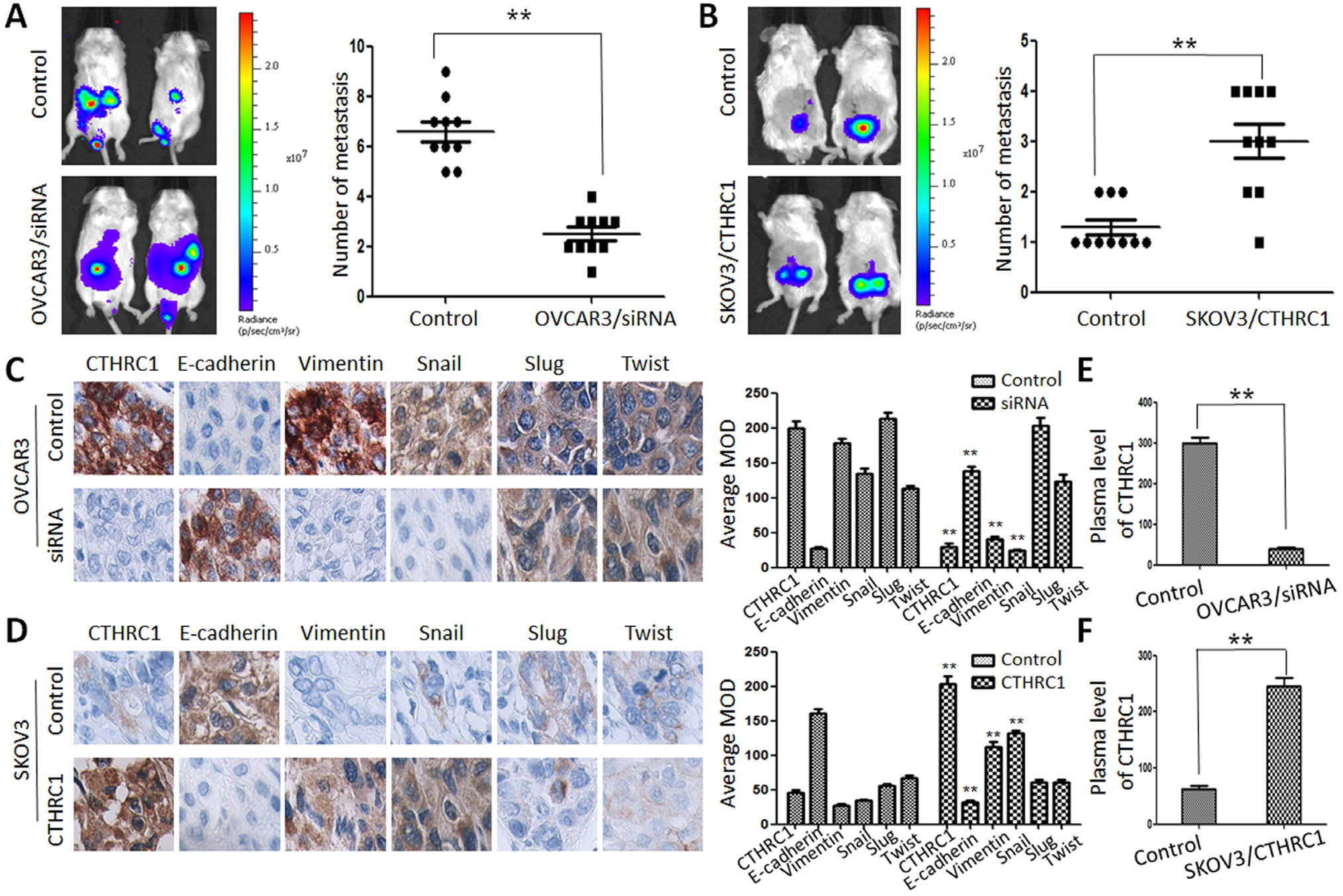 Figure 8: CTHRC1 promoted tumor metastasis by regulating EMT in vivo. (A, B) Representative BLI images of mice bearing OVCAR3/CTHRC1-siRNA or SKOV3/pcDNA3.1-CTHRC1 tumors with metastatic lesions. Mice (n = 10) were imaged six weeks later to observe local tumor growth and metastasis (**p < 0.01). (C, D) CTHRC1 promoted the EMT process in vivo. IHC demonstrated that CTHRC1 increased vimentin and Snail expression, and decreased E-cadherin expression in the primary xenograft tumor tissues (magnification: 200 ×). (E, F) In the mice with OVCAR3/CTHRC1-siRNA xenograft tumor, the CTHRC1 protein levels in the plasma were lower than that in the control. In contrast, in the SKOV3/pcDNA3.1-CTHRC1 group, the CTHRC1 protein levels in the plasma were higher than that in the control (**p < 0.01).