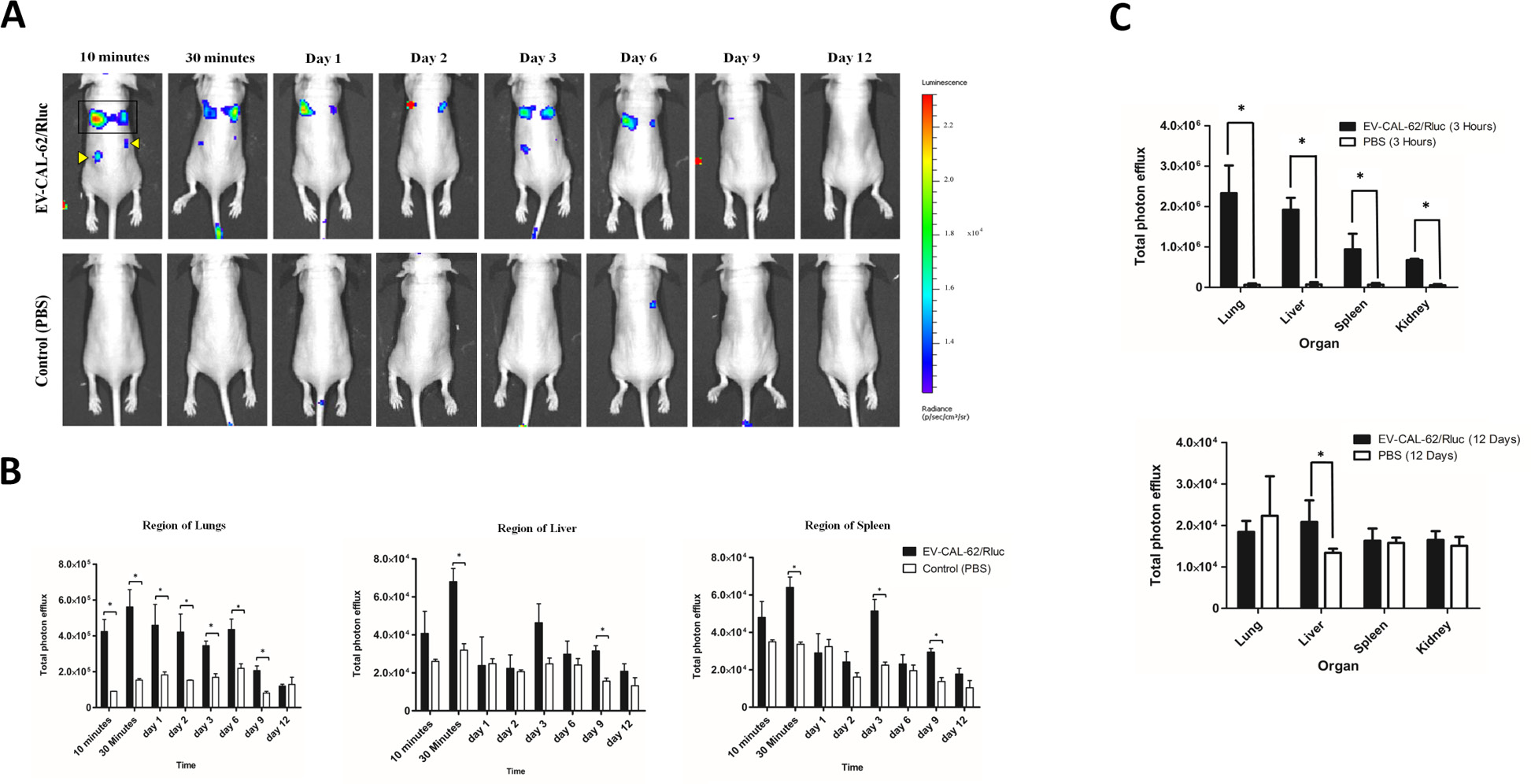 Figure 5: In vivo noninvasive bioluminescent visualization of EV-CAL-62/Rluc biodistribution in nude mice and organ distribution. (A) Representative in vivo bioluminescent imaging (BLI) of EV-CAL-62/Rluc in nude mice. EV-CAL-62/Rluc or PBS (control) was administered via the tail vein. Coelenterazine was injected via the same route at 10 and 30 min and 1, 2, 3, 6, 9, and 12 days after initial administration to visualize EV-CAL-62/Rluc. Regions of the lung (four-sided box), liver (right arrowhead), and spleen (left arrowhead) are indicated in the animal (at 10 minutes). (B) Quantitation of EV-CAL-62/Rluc signal from regions corresponding to the lung, liver, and spleen after EV administration; the values are expressed as mean ± SD. *P < 0.05 (Student’s t-test). (C) Quantification of dissected organs of mice injected with EV-CAL-62/Rluc (n = 3) or PBS (n = 3). The mice were euthanized at 3 hours and 12 days after injection. Organs were harvested and lysed, and Rluc activity was measured. Bioluminescence quantification of lungs, liver, spleen, and kidneys at 3 hours and 12 days (EV-CAL-62/Rluc or PBS); the values are expressed as mean ± SD, *P < 0.05, (Student’s t-test).