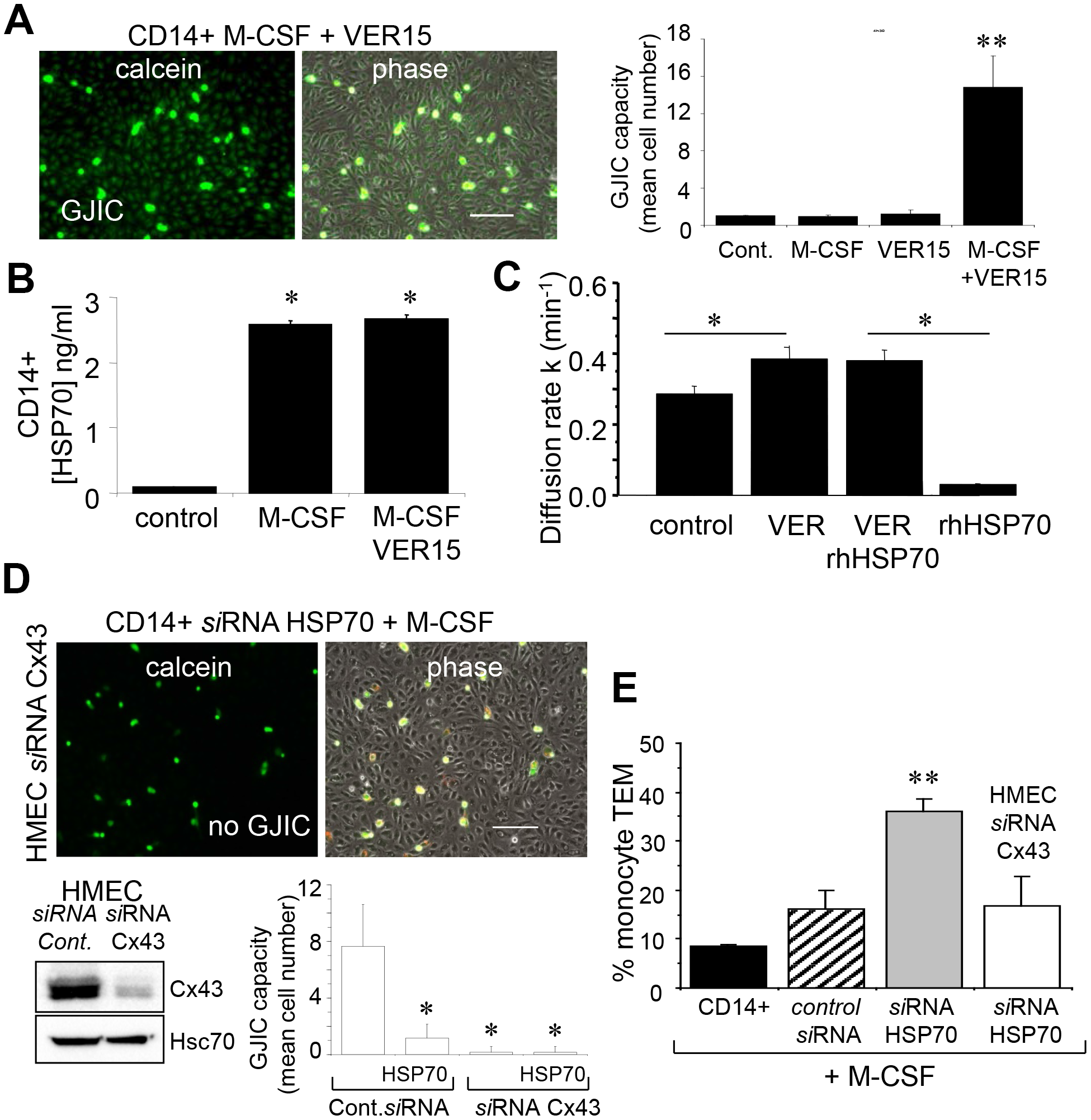 Figure 7: The endothelial Cx43 expression is required for the transendothelial migration of monocytes. (A) The adenosinederived inhibitor of HSP70, VER155008 (10 μM) favors the establishment of GJIC between monocytes (M-CSF stimulated) and HMEC within 3 h. Phase-contrast microphotographs are representative of 4 experiments. Bar 100 μm. Right, histogram represents the total cell number of HMEC receiving dye (calcein) per monocyte (mean ±SD, n=3; **P-values <0.01 vs control). (B) VER155008 does not inhibit the HSP70 release by M-CSF-stimulated monocytes for 12 h (dosed by ELISA; mean ± SD, n=4; *P-values <0.05 vs control). (C) VER155008 antagonizes the blocking effect of rhHSP70 on GJIC between HMEC (gap-FRAP analysis). Histogram shows the constant k measured for the coupled cells after 1 h of cell treatment (mean ± SD, n=4; *P-values<0.05 vs control). (D) Effects of the endothelial Cx43 knockdown on the GJIC coupling between HMEC and HSP70 depleted monocytes. Cultured HMEC and monocytes were transfected respectively with siRNA Cx43 (HMEC) and siRNA HSP70 (monocytes) or control siRNA, 48h prior to various analysis. Insert is representative western blot showing the specific depletion of Cx43 in HMEC. Transfected monocytes (donors), stimulated overnight with M-CSF, were pre-loaded with calcein and DiL-C18 before to be plated. Microphotographs of monocytes in contact with transfected HMEC (receivers) after 3 h of culture (representative of 6 experiments; Bar 100 μm). Histogram represents the mean cell number of neighboring HMEC receiving dye (calcein) per monocyte (mean ±SD; n=50 labeled monocytes examined; n=3). (E) Effects of the endothelial Cx43 knockdown and released HSP70 on the transendothelial migration of monocytes. Control or transfected HMEC monolayers grown on Transwells were kept in FCSfree conditions overnight. Control or transfected monocytes (3x105 ) stimulated overnight by M-CSF, were labeled with phycoerythrinconjugated anti-CD14+ before to be added into the wells. Cells migrating through the endothelial layers were counted (after 3 h). Data are percentage of total applied monocytes counted by flow cytometry (mean ± SD; n=5).