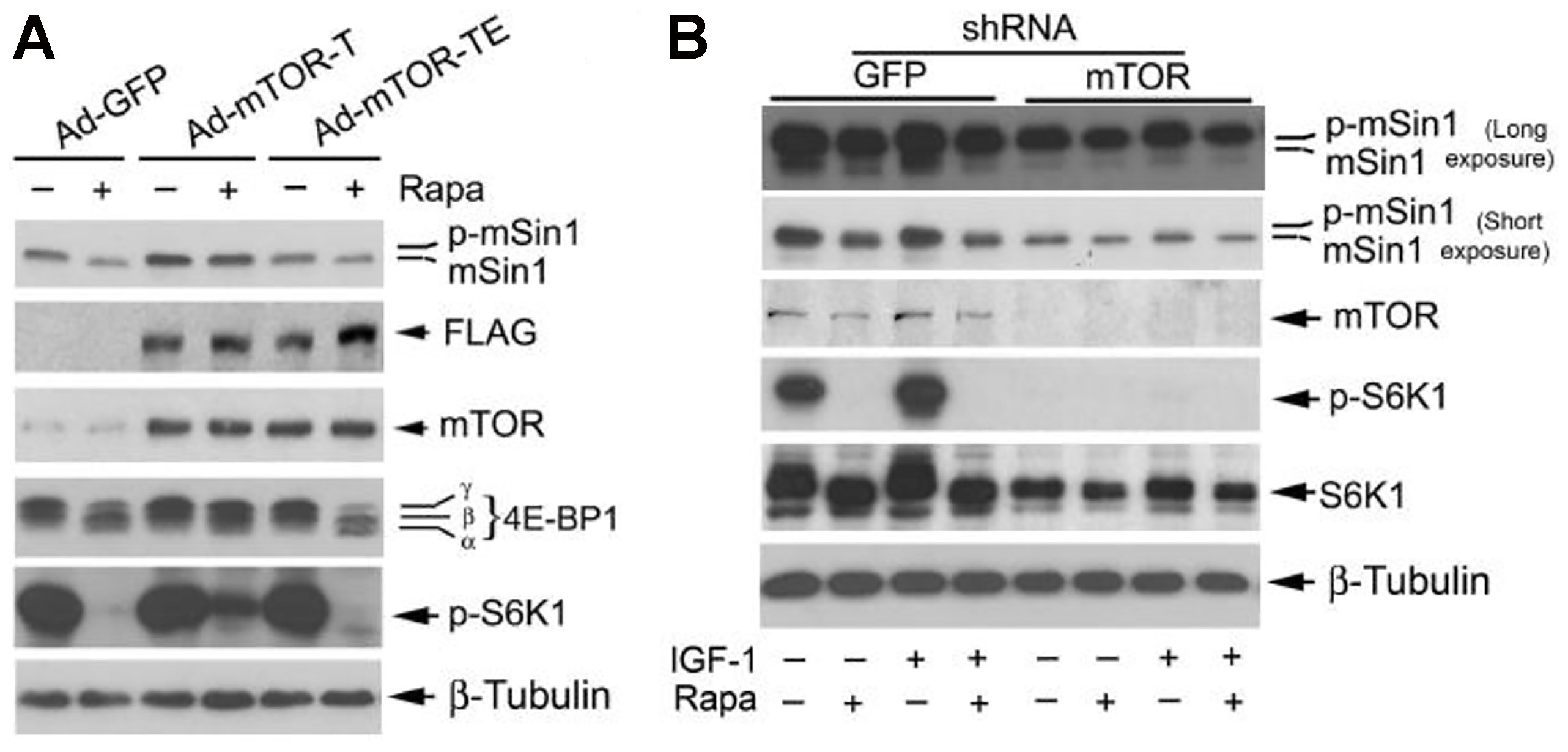Figure 3: Rapamycin-induced dephosphorylation of mSin1 is dependent on mTOR kinase activity. Rh30 cells, infected with recombinant adenoviruses expressing GFP (Ad-GFP), FLAG-tagged rapamycin-resistant and kinase active mTOR (S2035T, Ad-mTOR-T), and rapamycin-resistant and kinase dead mTOR (S2035T/D2357E, Ad-mTOR-TE) (A) or with lentiviral shRNAs to GFP and mTOR (B) respectively, were serum-starved for 24 h. The cells were then pretreated with or without rapamycin (Rapa, 100 ng/ml) for 2 h, and further stimulated with or without IGF-1 (10 ng/ml) for 10 h, followed by Western blotting with indicated antibodies.