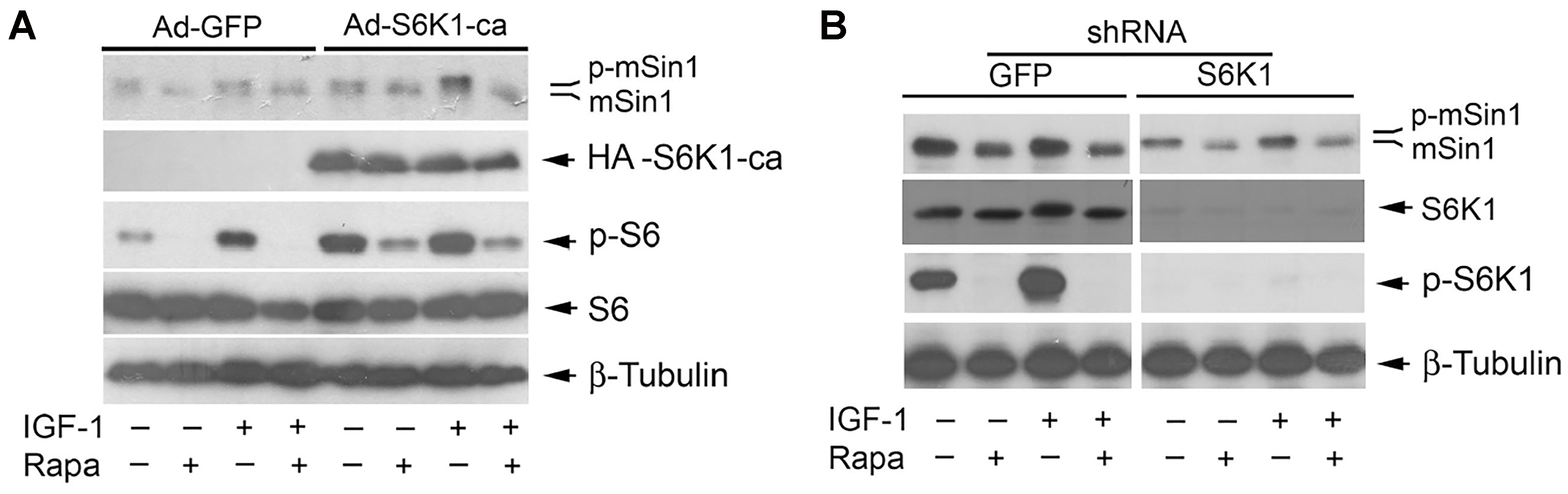 Figure 4: Rapamycin-induced dephosphorylation of mSin1 is not by inhibiting S6K1. Rh30 cells, infected with recombinant adenoviruses expressing GFP (Ad-GFP) and HA-tagged rapamycin-resistant and constitutively active S6K1 (Ad-S6K1-ca) (A) or with lentiviral shRNAs to GFP and S6K1 (B) respectively, were serum-starved for 24 h. The cells were then pretreated with or without rapamycin (Rapa, 100 ng/ml) for 2 h, and further stimulated with or without IGF-1 (10 ng/ml) for 10 h, followed by Western blotting with indicated antibodies.